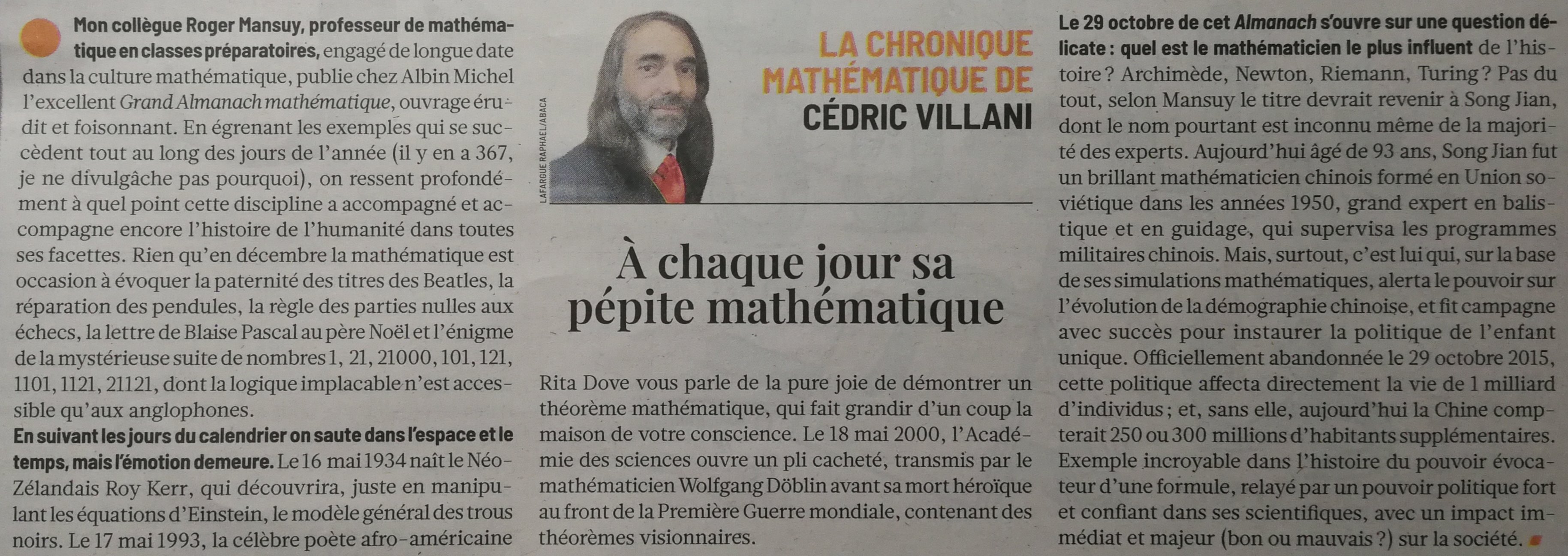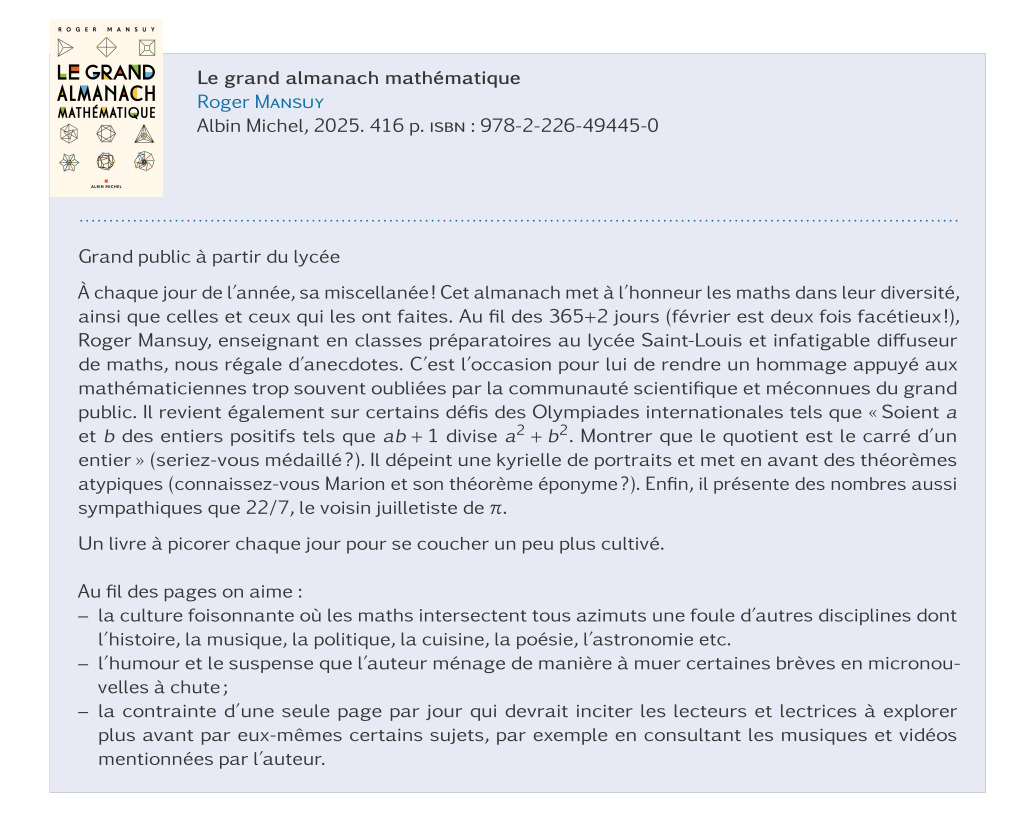 - Images des mathématiques, 25 novembre 2025 (recension par Régis Goiffon) Le grand almanach mathématique