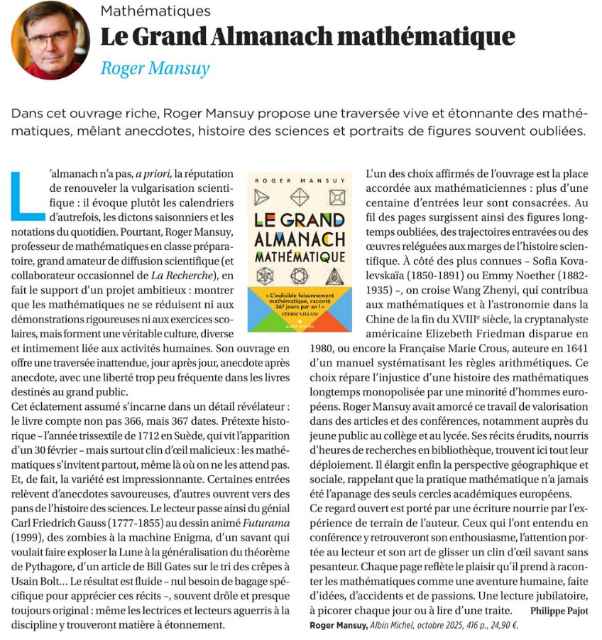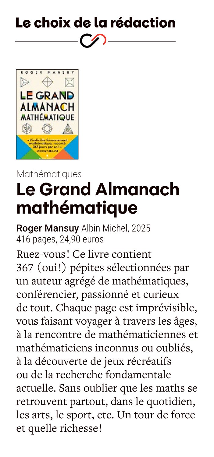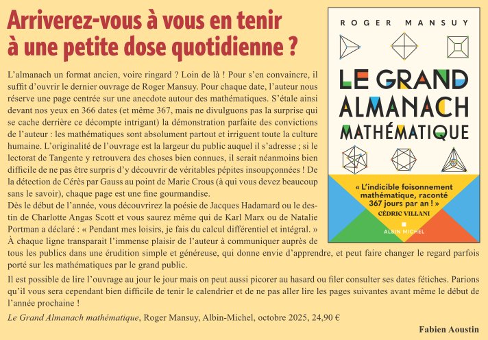 - À fond la Science, octobre 2025 (recension) Le grand almanach mathématique